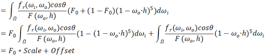 对于左边在球面上入射光的Irradiance,这一部分一般在软件内预卷积完成了。而有右边的积分才是我们需要主要计算的积分项。对于该积分项肯定不能在实时中计算,我们已知将会使用法线分布函数和几何遮蔽函数的逻辑,那么将这个积分也预计算然后实时采样肯定才是最好的。预计算该积分唯一的变数就是里面的三个变量:法线与出射角夹角,物体的表面粗糙度,还有菲涅尔的折射率F0(入射角ωi则是积分的主角)。如果将三个变量都根据值的组合做成贴图,那么需要一个Cube或者其他的一些保存方式,这肯定是一个复杂的过程和开销。如果能仅预计算两个变量,那么我们在实时采样时仅需要采样一张二维贴图就好了。而现实中往往也是将菲涅尔的折射率F0从积分中拆出来,这需要一些数学运算: