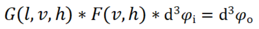 由于引入了微平面法线ωh,原来的宏观法线n与入射光线l夹角改为了微观法线h与入射光线l的夹角。此时我们已知入射的辐射通量可以得出出射的辐射通量,从入射到出射,这个过程中受到了几何遮蔽函数G和菲涅尔系数F的损失,有: