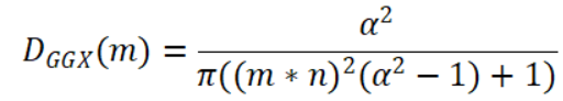 Trowbridge-Reitz分布被Walter等人独立重新发现并发表在2007年的论文中,并将其命名为GGX分布。在GGX分布被重新发现并提出之后,开始在电影和游戏行业中广泛传播与应用,成为了如今游戏行业和电影行业中最常用的法线分布函数。GGX的分布函数如下所示: