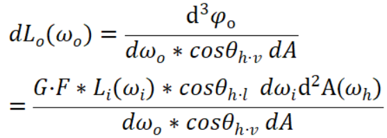 该方程可以写成微分形式,则入射的辐亮度L可以看成关于面积为微元A点p在入射方向微元立体角ωi方向上辐亮度的二阶导数: