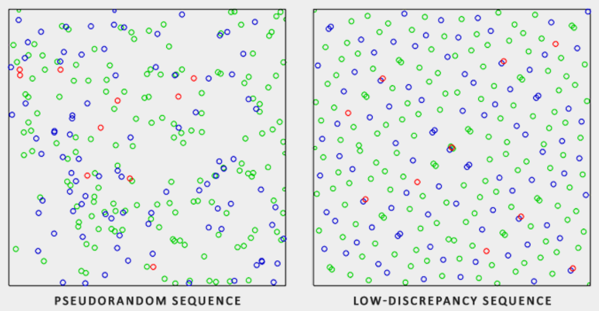 使用伪随机数产生随机采样会造成方向分布不均匀,因为伪随机数之间并不了解彼此的信息,可能会产生丛聚,这会导致蒙特卡罗积分方程式中,预估的准确性较差,收敛速度慢。通过使用低差异序列替换伪随机数,我们可以提高准确度,它本质上可以更好地保证分配的方向。使用Low-Discrepancy Sequence来生成蒙特卡罗采样向量,这个过程被称为Quasi-Monte Carlo准蒙特卡洛积分。Quasi-Monte Carlo方法有更快的收敛速度,使他能够胜任大型复杂的应用。