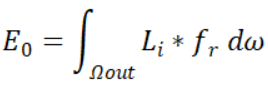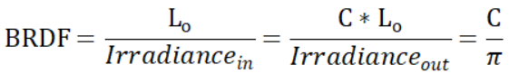 其中E0为出射角的辐照度Irradiance,Ωout为表面法线为中轴线所在的半球。由于对于半球上的每个立体角微分而言,入射的漫反射光都是一致的,根据这一点可以直接算出Eo的值等于Lo*。进而可知对于每个漫反射的BRDF都需要除以π才能获得正确的值。