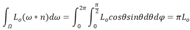 其中Lo为ω方向的光照,此时可以得知,均匀向半球发射的光照的总的辐照度等于某一方向的辐亮度乘以π:
