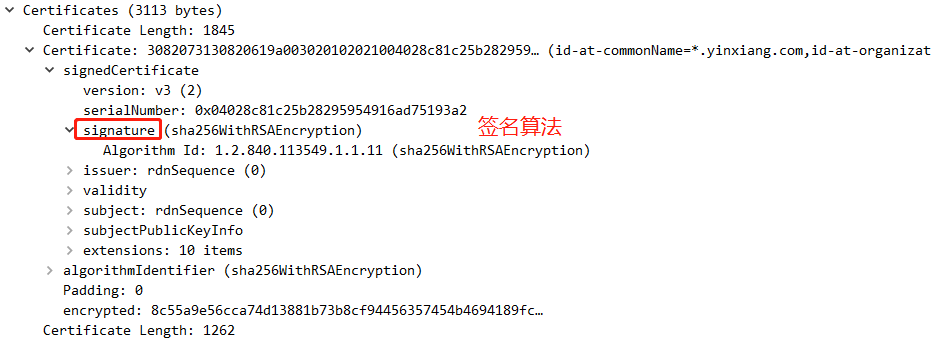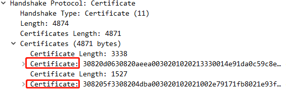 接着服务端给客户端发来了2个证书。第二个证书是第一个证书的签发机构(CA)的证书。
