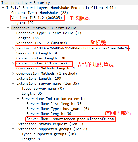 协商加密算法 。在Client Hello里面客户端会告知服务端自己当前的一些信息,包括客户端要使用的TLS版本,支持的加密算法,要访问的域名,给服务端生成的一个随机数(Nonce)等。需要提前告知服务器想要访问的域名以便服务器发送相应的域名的证书过来。