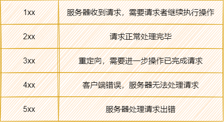 1XX:消息状态码。 2XX:成功状态码。 3XX:重定向状态码。 4XX:客户端错误状态码。 5XX:服务端错误状态码。