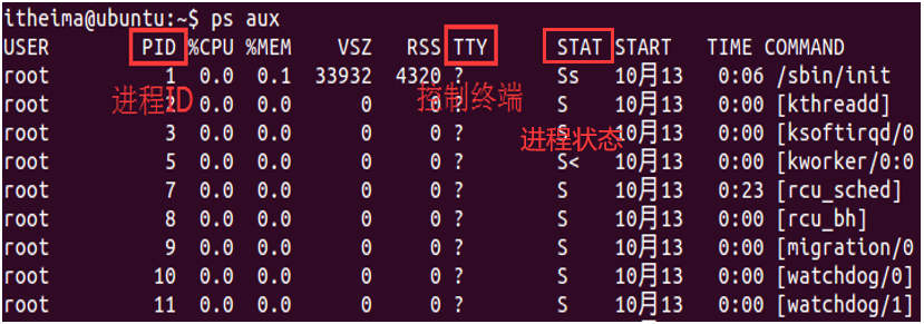 (1)ps aux:显示这个操作系统上所有进程的信息,相当于一个拍照,不能动态显示。