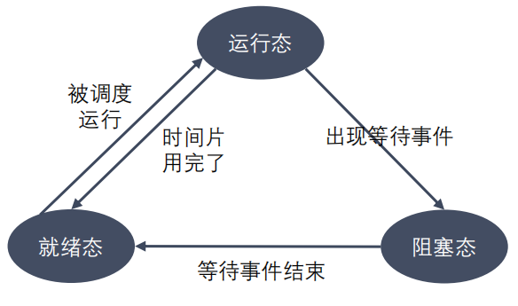 在三态模型中,进程状态分为三个基本状态,即就绪态,运行态,阻塞态。