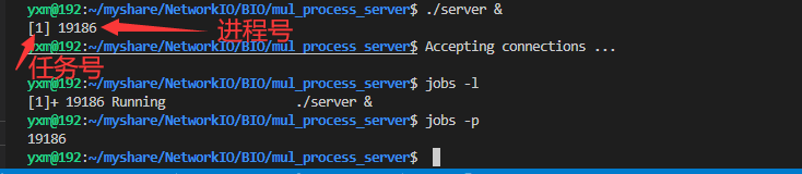 yxm@192:~/myshare/NetworkIO/BIO/mul_process_server$ jobs -l # 列出后台进程,存在后台进程