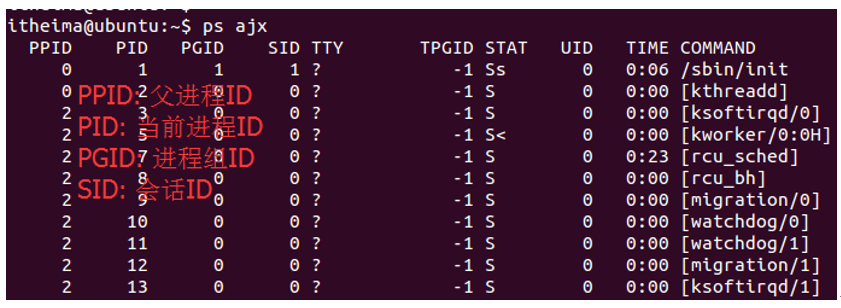 (3)ps ajx:以比较完整的格式显示所有的进程,会显示进程的父进程 ID、进程组 ID、会话 ID 等
