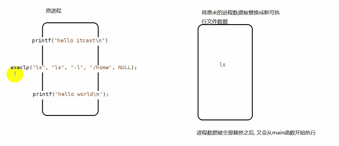{printf("hello itcast\n");// arg0 arg1 arg2 .... argn// arg0一般是可执行文件名, argn必须是NULL//execlp("ls", "ls", "-l", "/home", NULL);// 第一个参数是可执行文件的相对路径或者绝对路径// 第二个参数是可执行文件的名字// 中间的参数是可执行文件的参数// 最后一个参数必须是NULL//execl("/bin/ls", "ls", "-l", "/home", NULL);// 第一个参数是可执行文件的名字// 第二个参数是指针数组,最后一定以NULL结束// char *argv[] = {"ls", "ls", "-l", "/home", NULL};// execvp("ls", argv);// 最后一个参数是环境变量指针数组,最后一定以NULL结束char *envp[] = {"ADDR=BEIJING", NULL};execle("ls", "ls", "-l", "/home", NULL, envp);printf("hello world\n"); // 注意:如果进程替换执行成功,本行不会被执行return 0;
