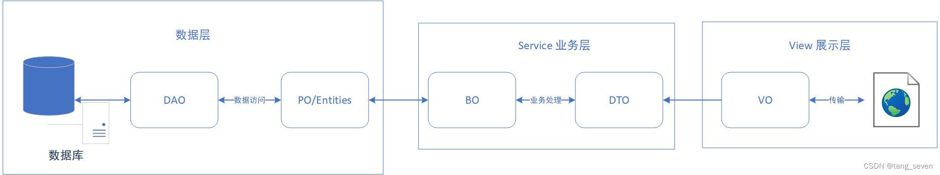 DTO:Data Transfer Object,数据传输对象,用于展示层与服务层之间的数据传输对象。(注:实际开发中还存在BO,其作用和DTO类似,当业务逻辑不复杂时一般会被合并。)