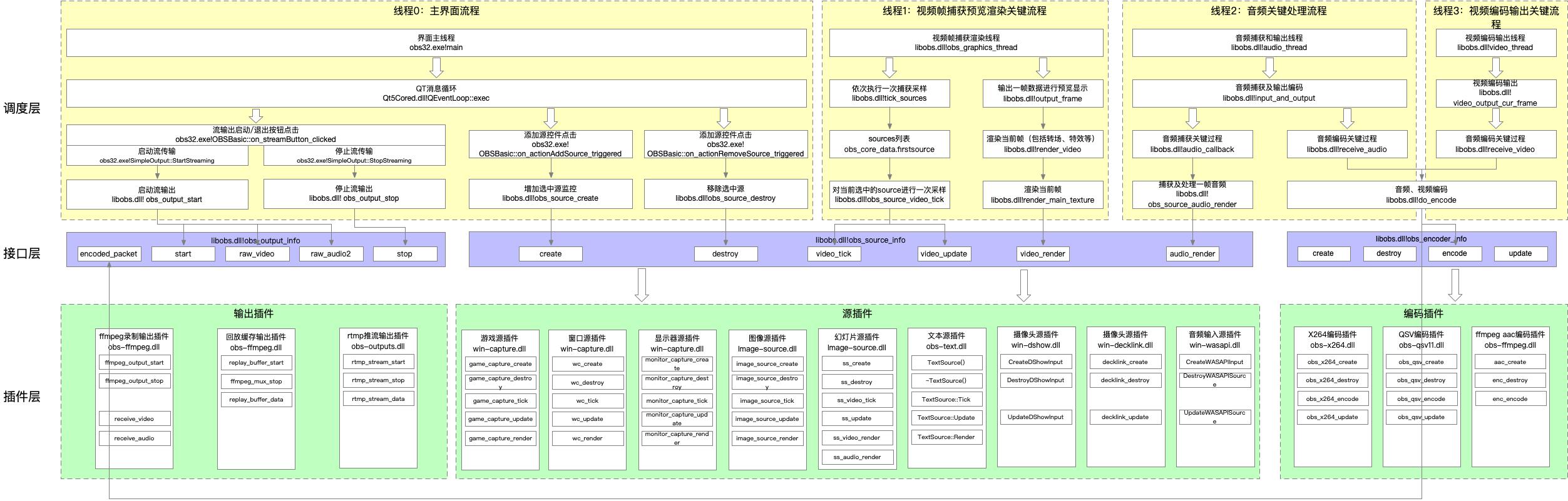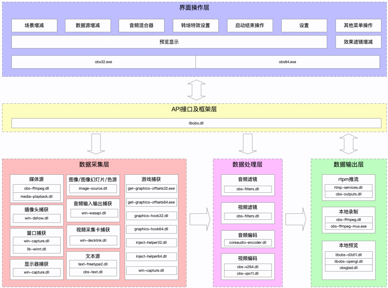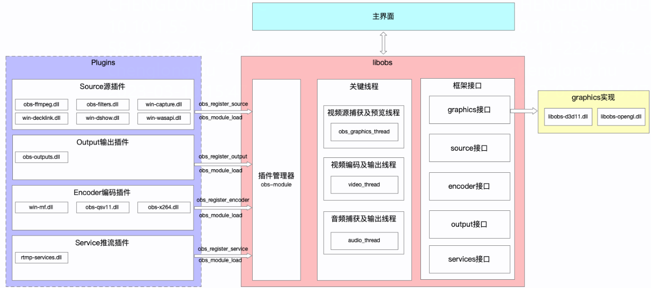 obs设计上的最大目标,应该是兼容和灵活。为了兼容各种平台、各种硬件、各种软硬件环境,灵活处理各种输出类型(推流、本地录制等)、各种输入源类别、各种编码类型,obs采用了模块化插件式设计,只需要拷贝插件模块到plugins目录,即可动态加载对应的功能。