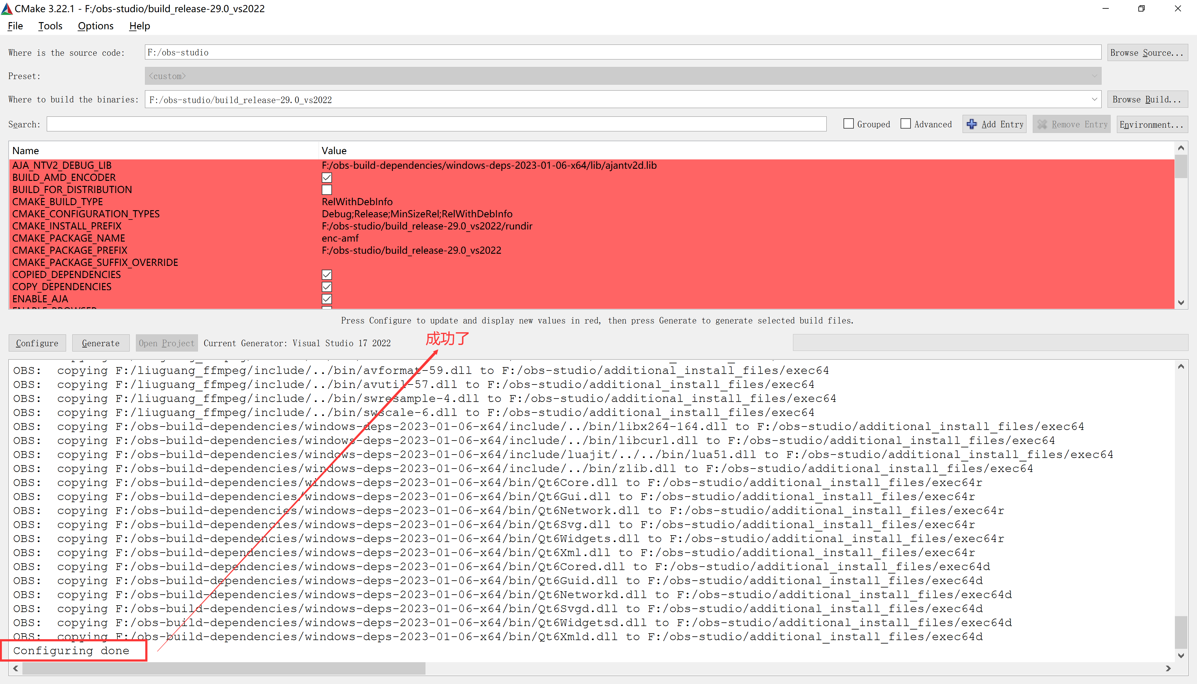 由上图可以发现:生成工程的过程中会将CMAKE_PREFIX_PATH 所设置的路径中的第三方库复制到了指定的目录中,这个目录后续会被用来安装obs64.exe的时候使用,将这些第三方库安装到F:\obs-studio\build_release-29.0_vs2022*rundir*\Debug\bin\64bi目录中。