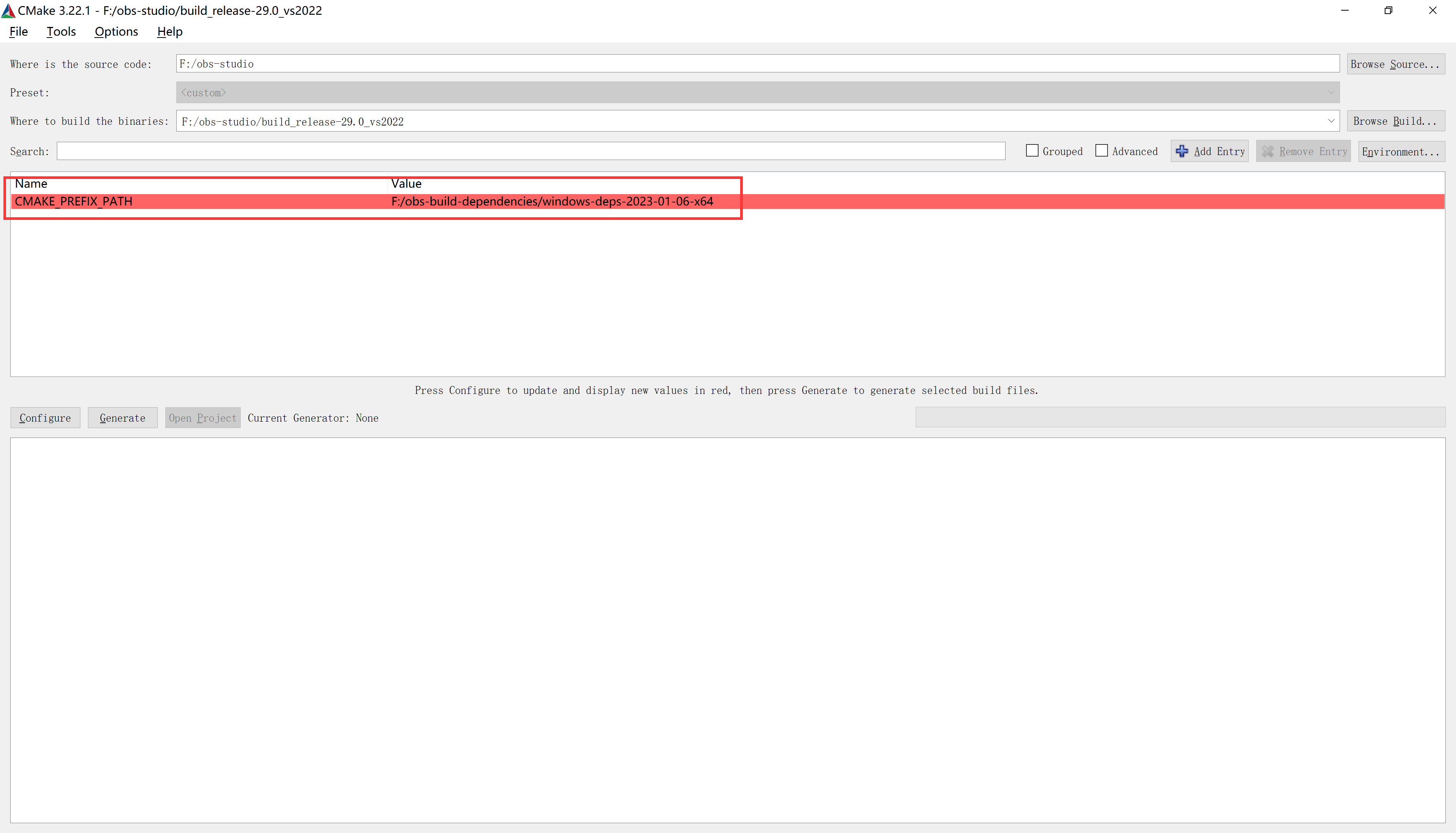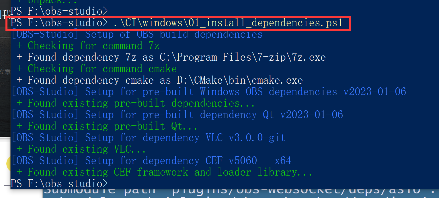 上述命令会将第三方的依赖库下载到指定的目录中,此处为F:\obs-build-dependencies\windows-deps-2023-01-06-x64,后面这个目录被用来配置CMAKE_PREFIX_PATH。当然除了windows-deps的依赖,还有一起的依赖,这些个依赖可以使用分号分开,一起配置CMAKE_PREFIX_PATH到中。