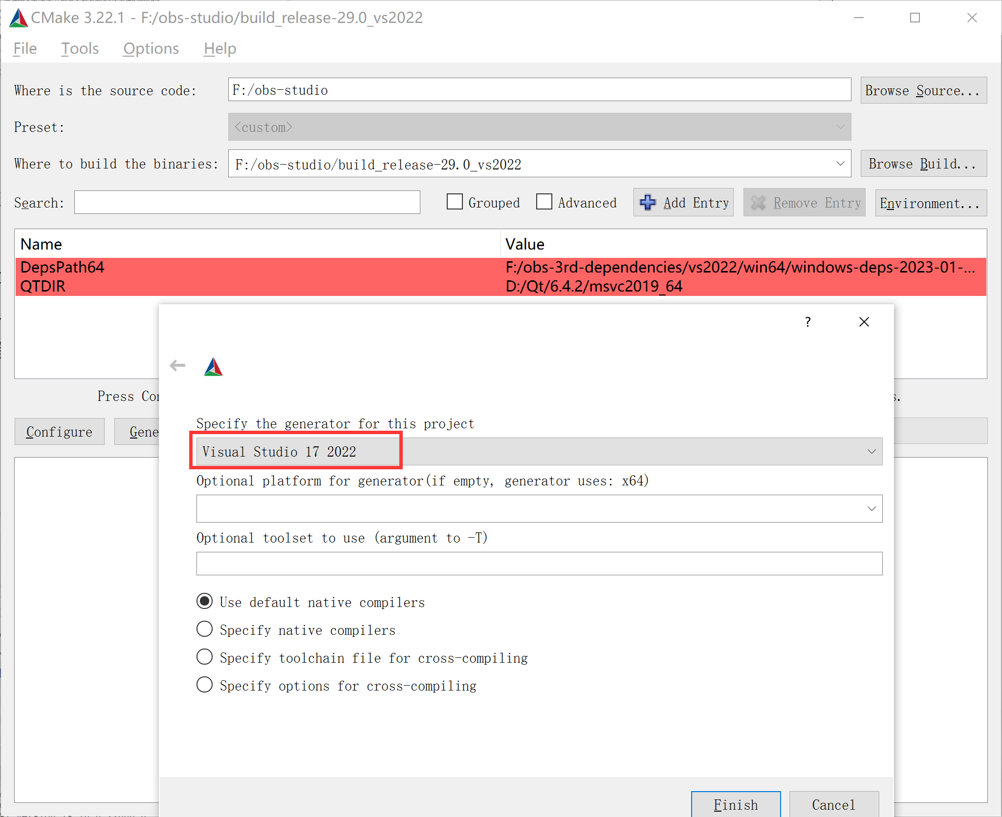 Configure:按照官网上推荐,选择生成VS2022的第三方库,选择Use default native compilers,具体如下: