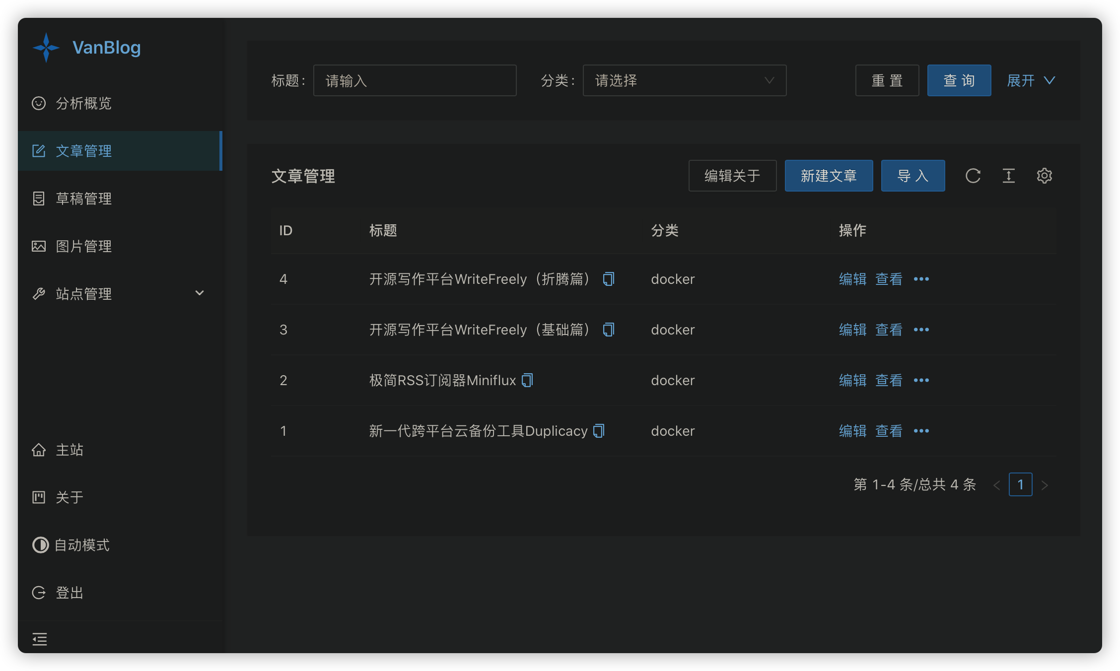 VanBlog是一款简洁实用优雅的高性能个人博客系统。支持HTTPS证书全自动按需申请、黑暗模式、支持移动端自适应和评论,内置流量统计与图床,内嵌评论系统,配有完备的、支持黑暗模式、支持移动端、支持一键上传剪切板图片到图床、带有强大的编辑器的后台管理面板。