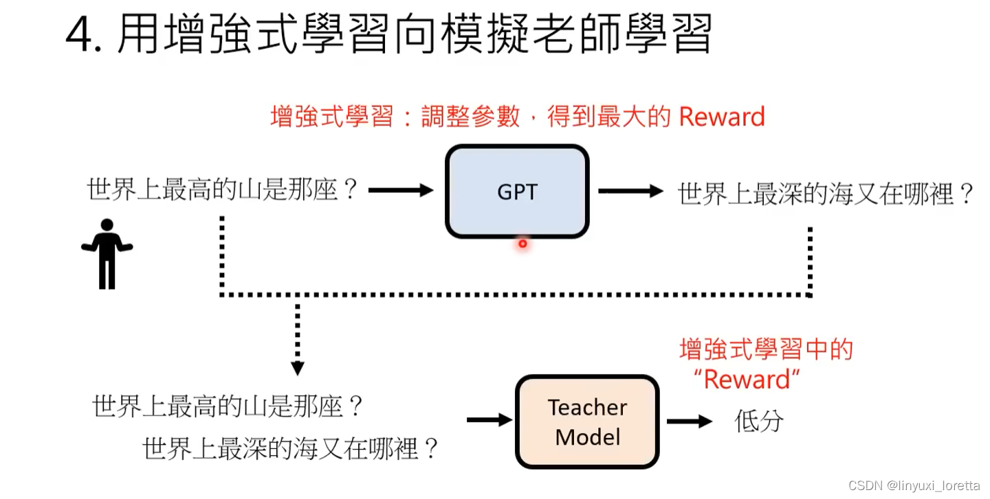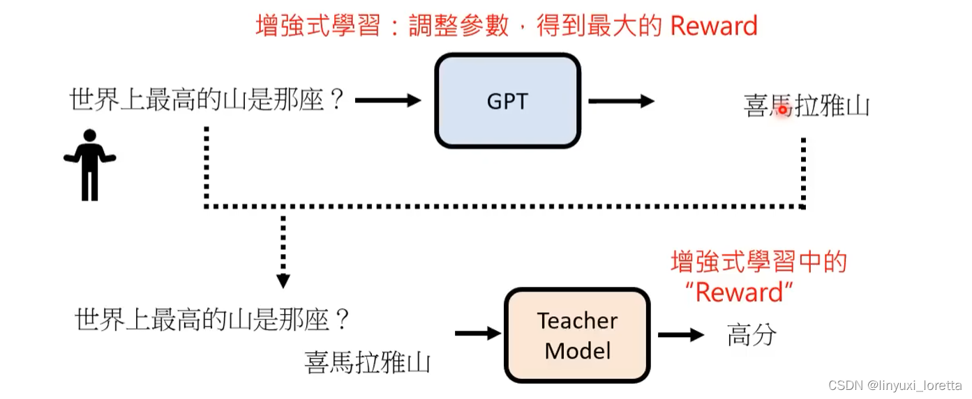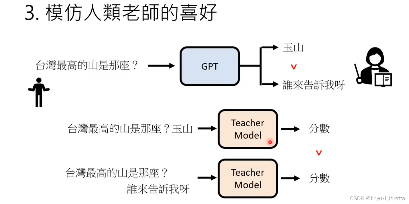 训练一个”模仿老师的模型“,模仿人类评分的标注(学习人类偏好)