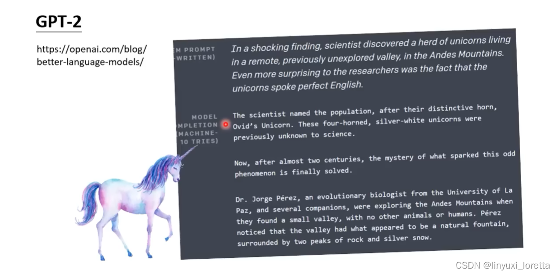 GPT-2可以 说一段话给他,他就开始瞎掰、并且像模像样。这种能力今天看起来很正常,但当时让学界震惊。