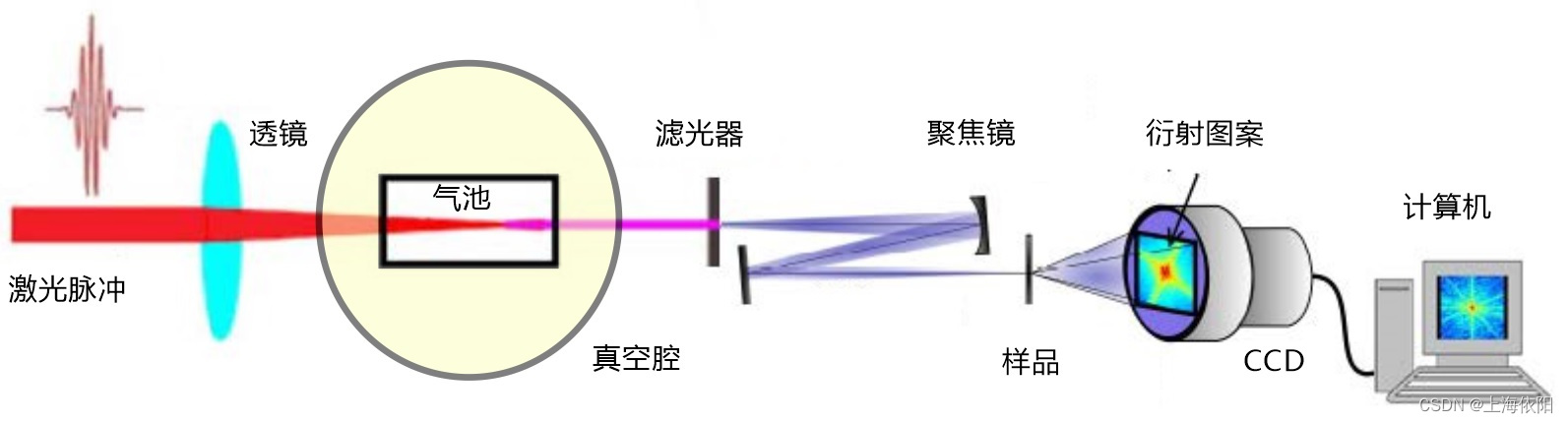 如图1所示是一个高阶谐波在相干衍射成像中应用的典型结构示意图,其中超短脉冲激光被聚焦在充满惰性气体的气池内从而激发出高阶谐波。