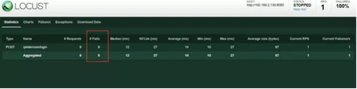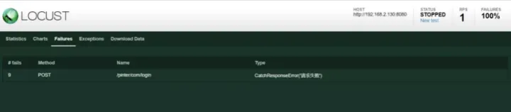 在压测执行过程中,如果遇到判断失败的请求,会在Locust的控制页面中显示出来