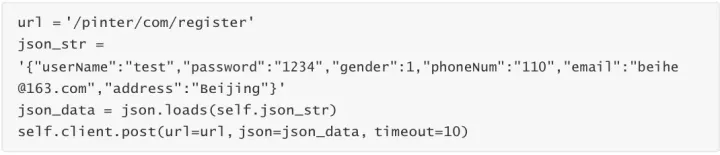 对于Json类型的POST请求,它的特点是入参是一个Json字符串,在调用self.client.post()函数时,需要把json字符串转为字典再传入
