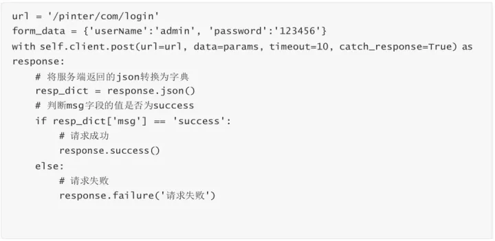 在Locust中,调用get/post函数时,加入一个catch_response=True参数,配合with语句,将服务端响应保存到一个变量里,就可以在代码中根据业务规则标记本次请求是成功还是失败。
