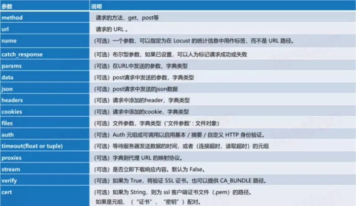 在发送get/post请求时,除了url、params、data、json、catch_response参数外,还支持一些其他的参数,请参考下面表格中的描述
