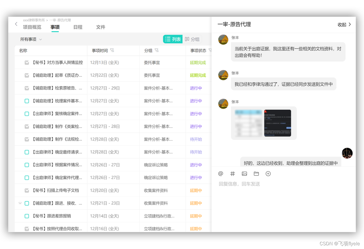在飞项中,我们可以通过日程面板来专注手头上案件任务的处理,也可以通过自定义视图的方式,来关注负责案件整体进展、年轻律师的任务完成情况,高效的兼顾更多任务的处理,问题的解决,案件的推进沟通都变得顺畅高效。