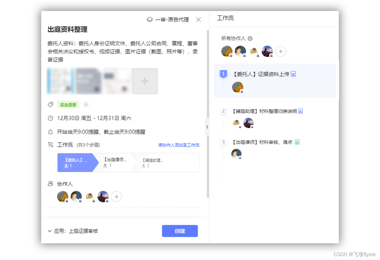 在接手到新案件时,可以用飞项的事项/工作流模板,制定流程化的审核模板。每个案件的流程步骤是怎样的,具体责任人是谁,需要投入多少人力,需要哪些材料等,都“导航”得清楚明白