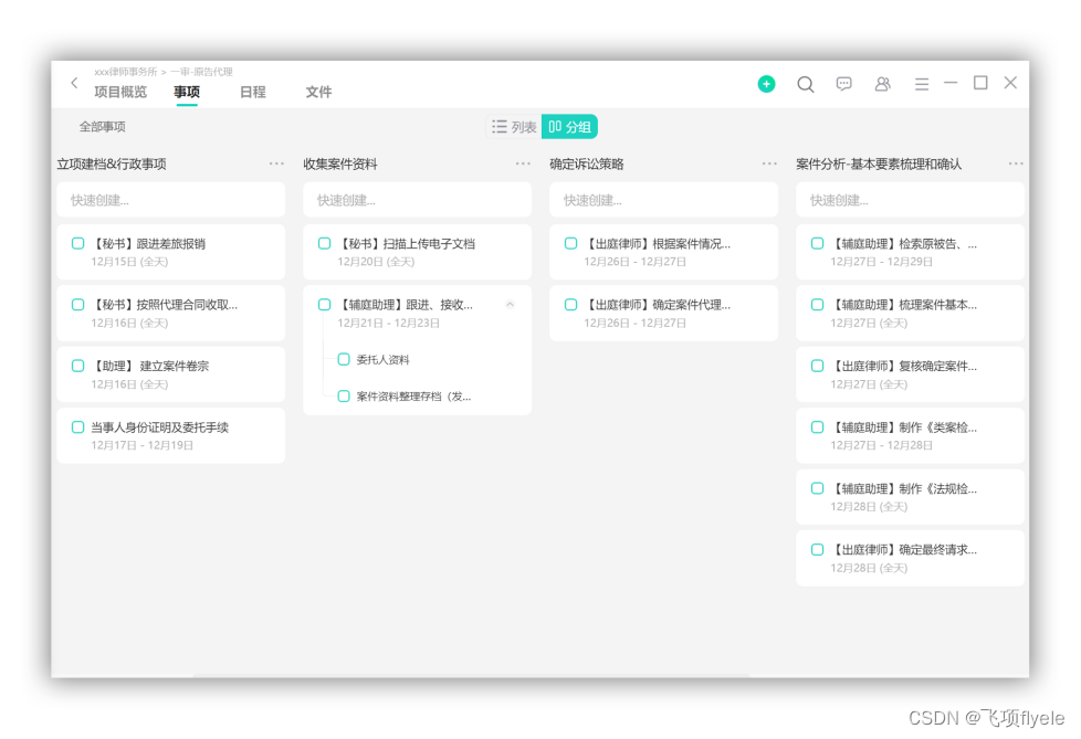 同时在飞项中,项目中的事项都可以在事项列表/分组中集中查看,管理者可根据不同进度或者不同类型的事项分组,快速查看各部分进度