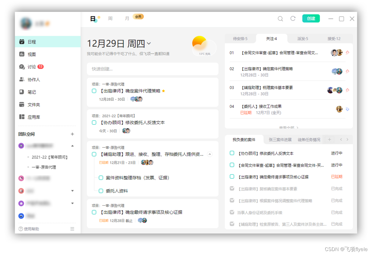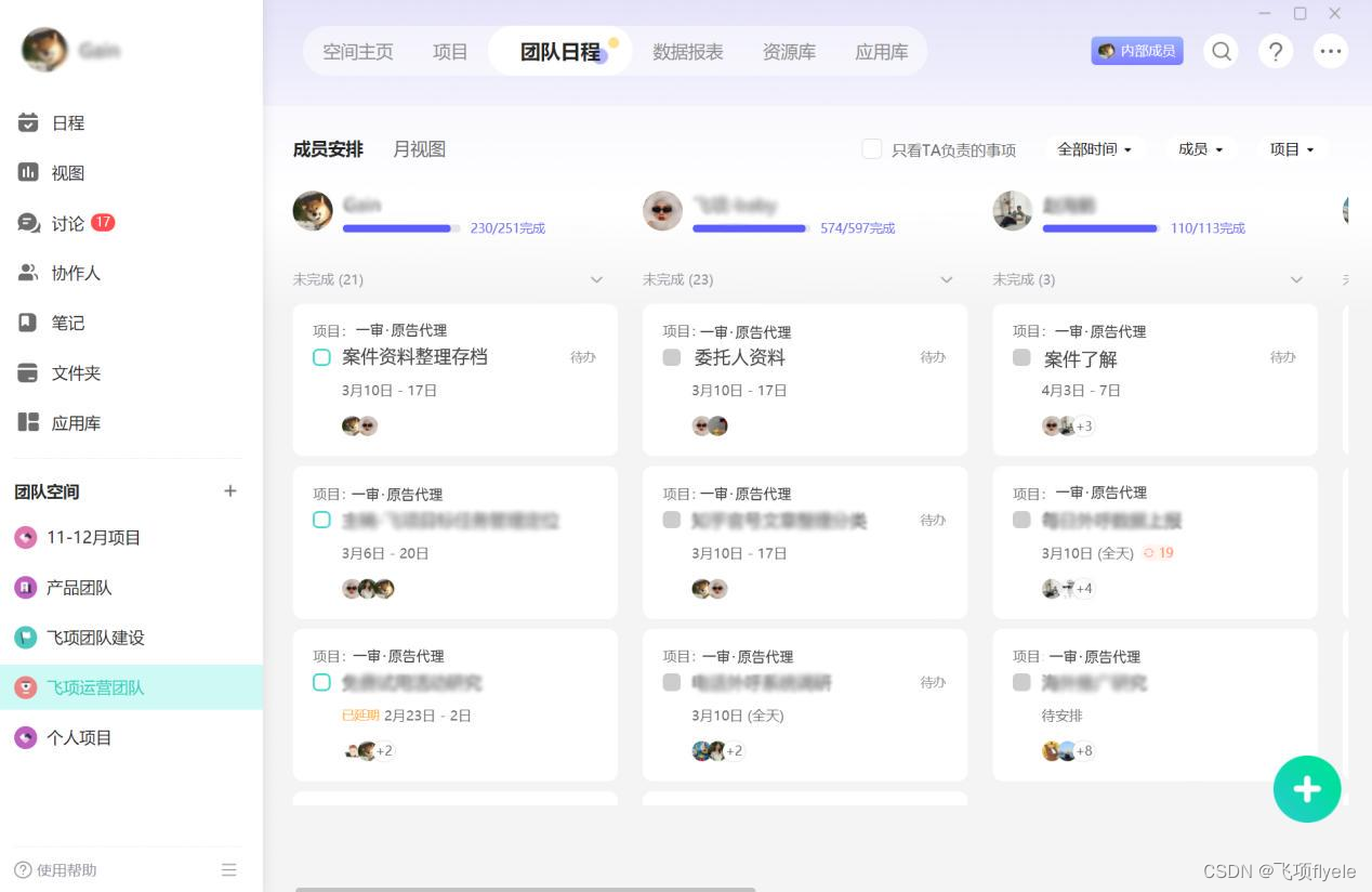 另外,对于派发给不同律师的案件,客户经理还可以在飞项空间-团队日程中,通过时间、成员、项目进行筛选,看到每一个律所手中负责的所有案件及进度,做好人与事的统筹管理。