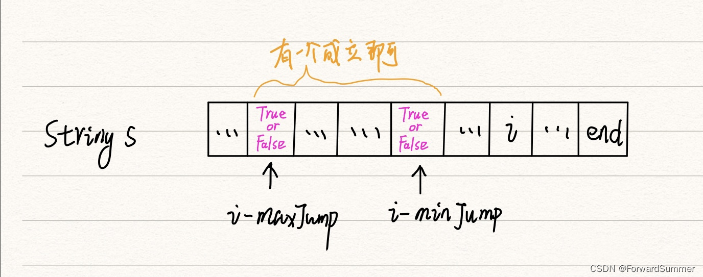 i + minJump <= j <= min(i + maxJump, s.length - 1) 且