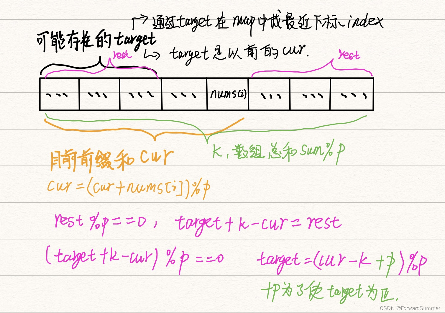 class Solution {public int minSubarray(int[] nums, int p) {int sum = 0;int pre = 0;//前缀和int min = nums.length;//保存最小值int len = min;HashMap map = new HashMap<>();for(int i : nums){sum = (sum+i)%p;}if(sum == 0) return 0;map.put(0,-1);for(int i = 0; i < len; i++){pre = (pre+nums[i]) % p;int target = (pre - sum + p) %p;if(map.containsKey(target)){int distance = i - map.get(target);min = Math.min(min,distance);}map.put(pre,i);}return min == len ? -1 : min;}