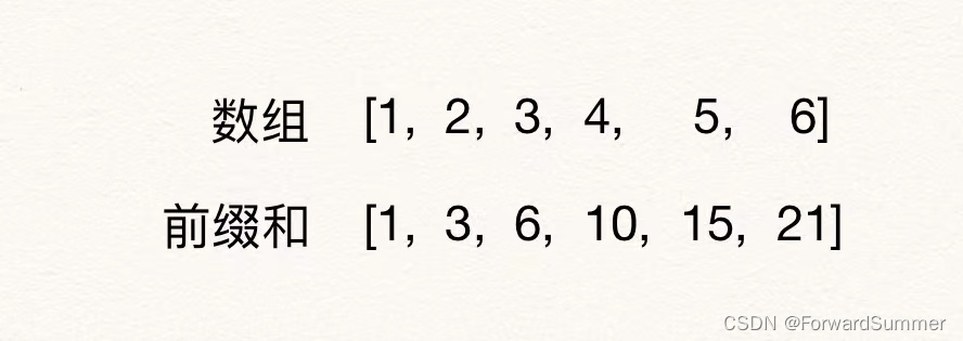 对于数组nums来说,前缀和pre[i] = pre[i-1] + nums[i],即每个位置上存储的是前i个数组元素的和,用数学公式表示为: