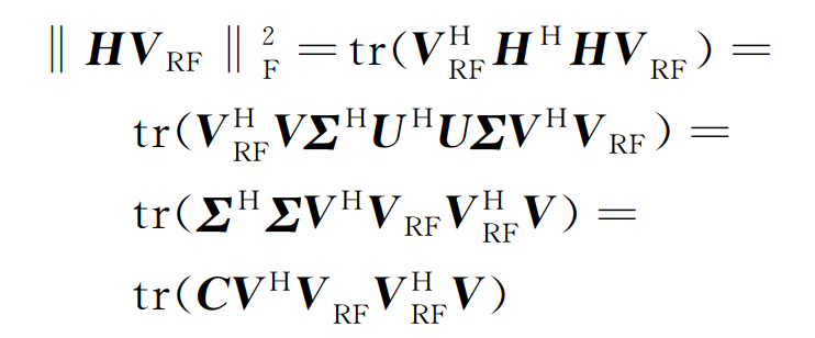 射频预编码使用模拟移相器实现的,只改变相位,不改变大小,所以中每个元素的模长为1。另外,由于发射机总功率的限制,这两个预编码满足: