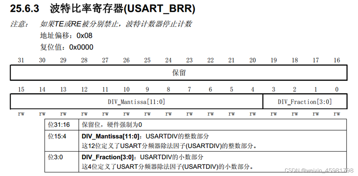 发送器和接收器的波特率由波特率寄存器BRR里的DIV确定