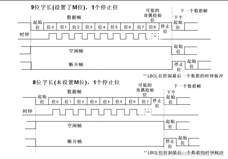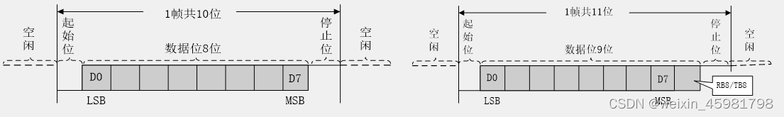- 空闲状态下,起始位为高电平,起始位给低电平,使其产生下降沿,表示数据帧要开始