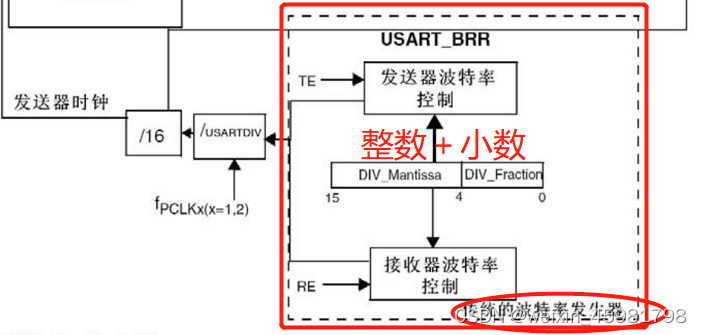 波特率发生器是分频器,APB时钟进行分频,得到发送和接收移位的时钟