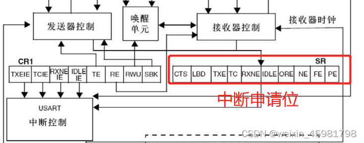 之后对时钟进行分频,除以USARTDIV的分频系数,分频后再除以16,得到发送器时钟和接收器时钟,通向控制部分