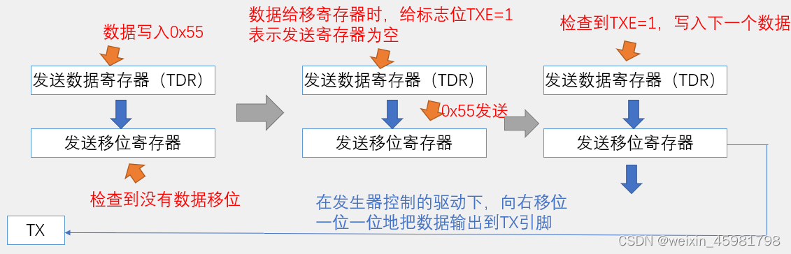 当数据移位完成后,数据会立刻自动从TDR发送移位寄存器
