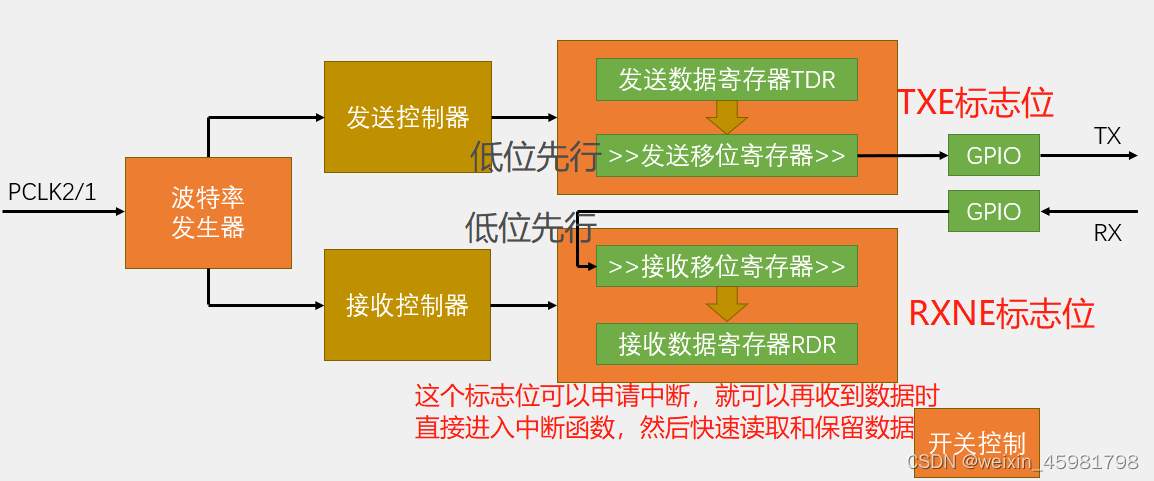 TXE发送寄存器空,RXNE接收寄存器非空,是判断发送状态和接收状态的必要标志位