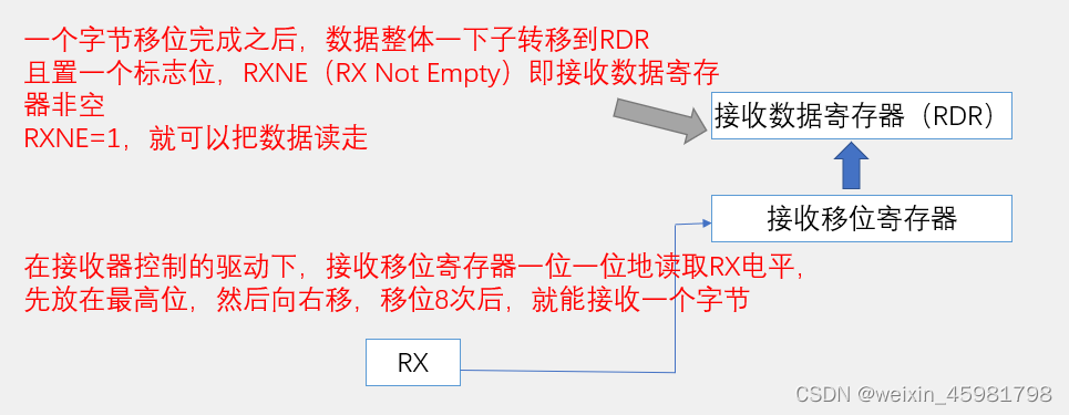 因为串口协议规定是低位先行,所以接收移位寄存器时从高位往低位方向移动