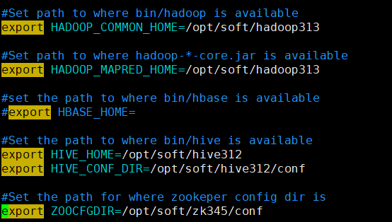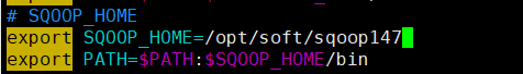 [root@hadoop conf]# vim ./sqoop-env.sh 22 #Set path to where bin/hadoop is available23 export HADOOP_COMMON_HOME=/opt/soft/hadoop31324 25 #Set path to where hadoop-*-core.jar is available26 export HADOOP_MAPRED_HOME=/opt/soft/hadoop31327 28 #set the path to where bin/hbase is available29 #export HBASE_HOME=30 31 #Set the path to where bin/hive is available32 export HIVE_HOME=/opt/soft/hive31233 export HIVE_CONF_DIR=/opt/soft/hive312/conf34 35 #Set the path for where zookeper config dir is36 export ZOOCFGDIR=/opt/soft/zk345/conf