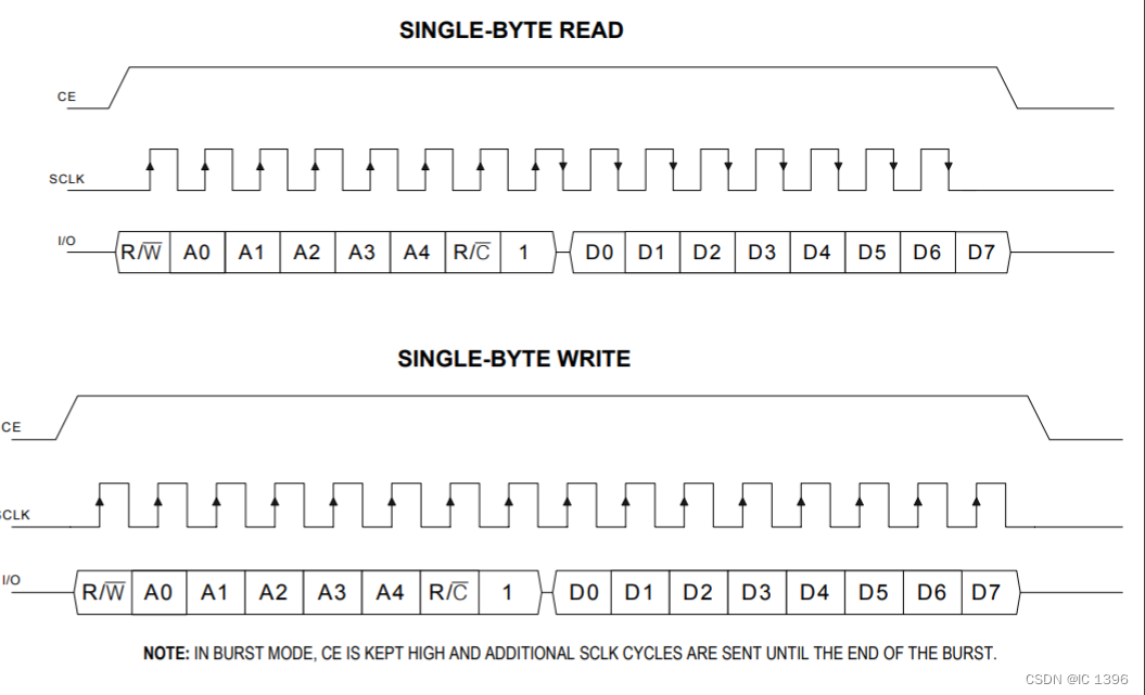DS1302时序图,单字节写操作时,均是上升沿写入