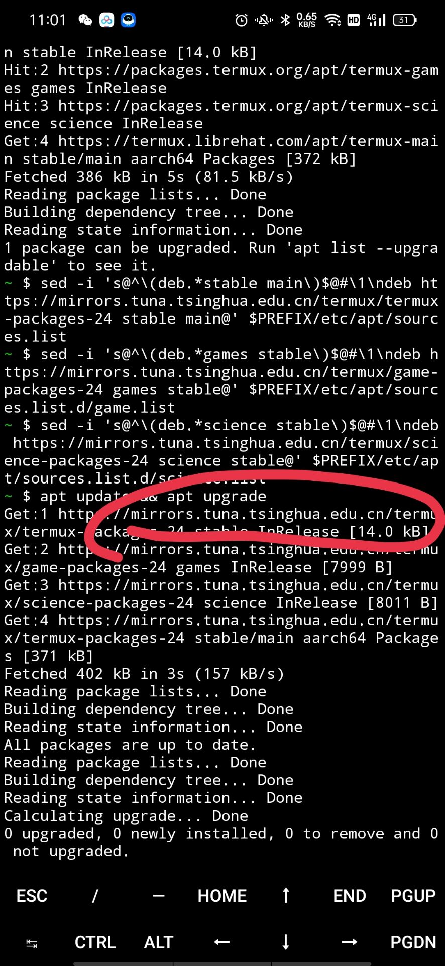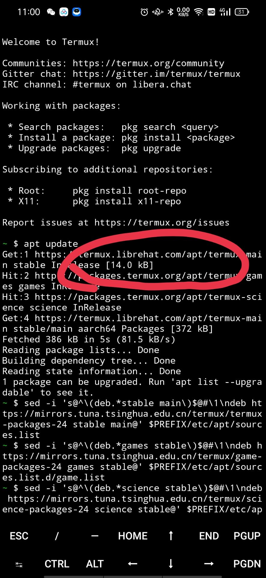 刚安装这三个软件包后只需打开Termux即可,打开后建议先输入(为了更新一下):