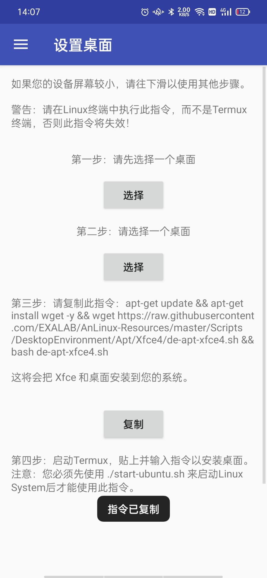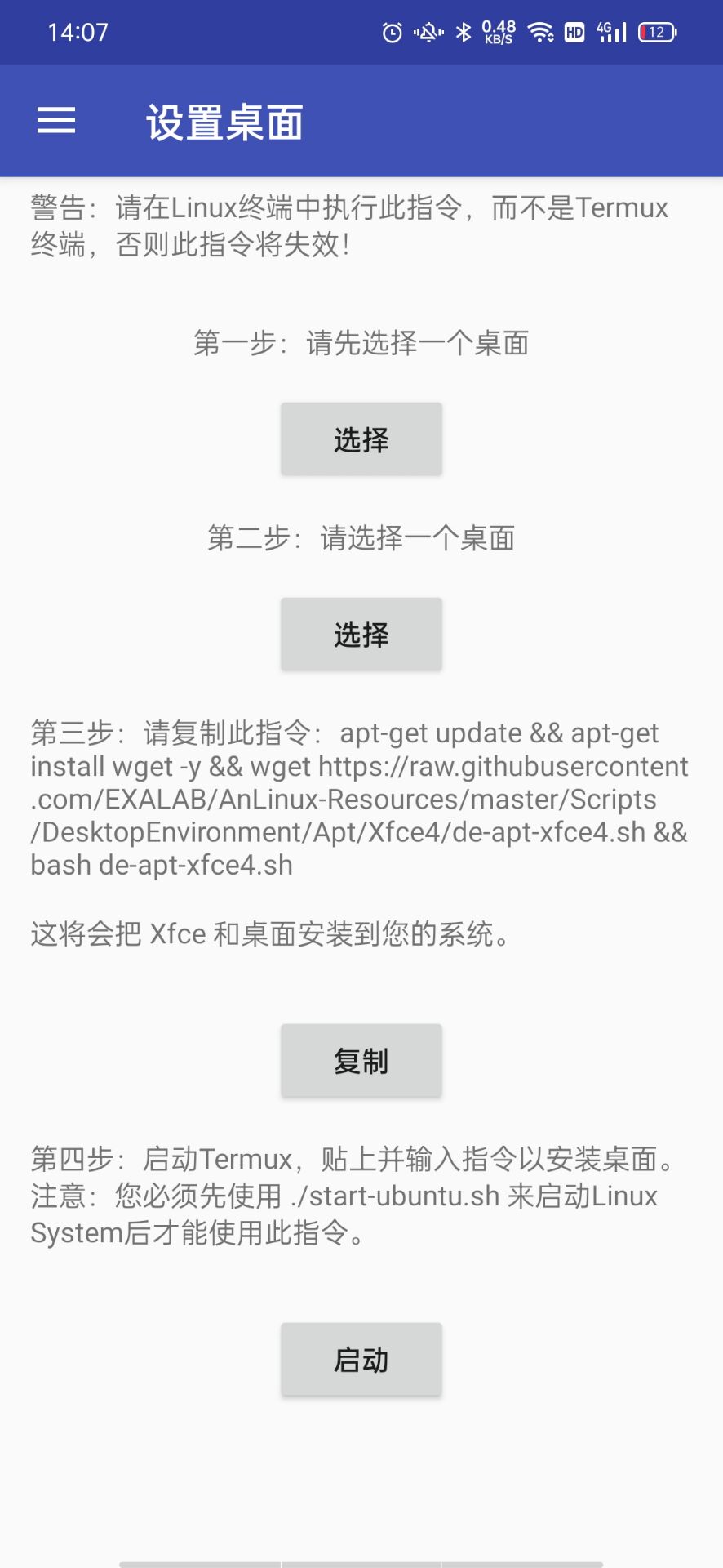 点击启动后,会自动进入Termux 界面,在$后输入复制的指令回车即可安装桌面。