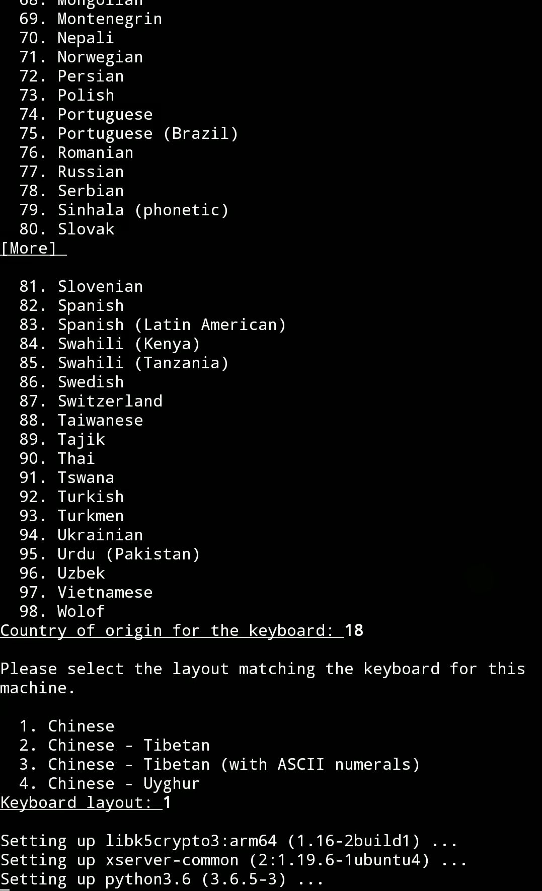 第一个选择的中文意思是 不是以上语言,然后会出现选择时区的选项 选择GMT+8,第三个选择是选择18(Chinese),第四个选择是选择1(Chinese)。