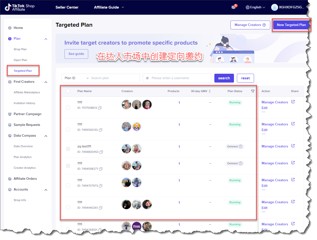 1、定向邀约:是指在TK达人市场页面,创建一个Targeted Plan,在该计划中,指定商品列表及相应的折扣,并邀请指定的达人加入此计划。