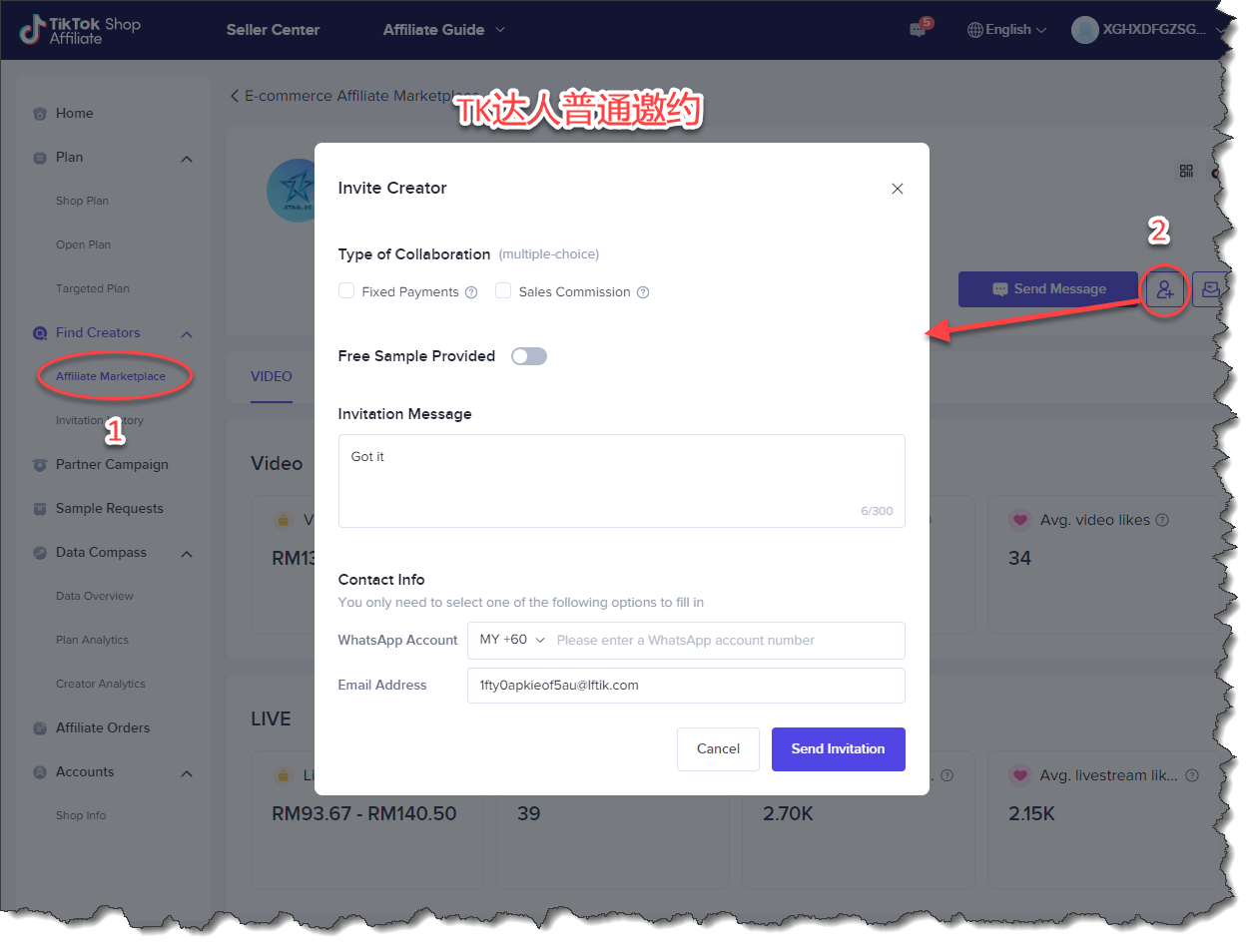 2、普通邀约:在TK达人市场页面,根据筛选条件检索出心仪的达人后,进入达人详情页面,点击“Invite creators”按钮, 在表单中填入合作细节(如佣金比例、样品提供等),邀请达人为您带货。
